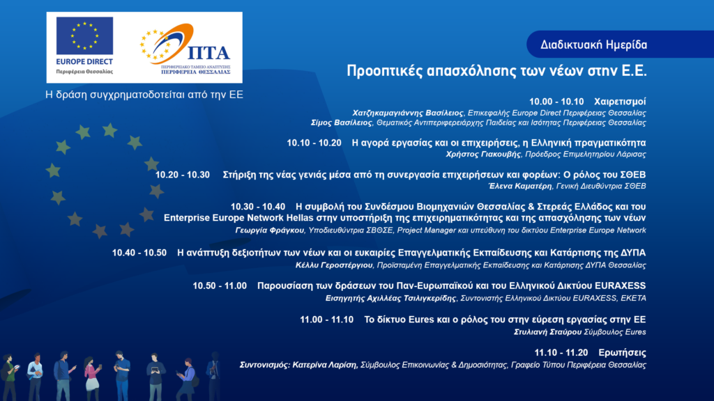 Europe Direct Thessaly plans on Tuesday, 21 October 2025 in the morning, the organization of an online event on "Employment prospects for young people in the European Union". The event will be held entirely online, from the 10:00 until 12:00.