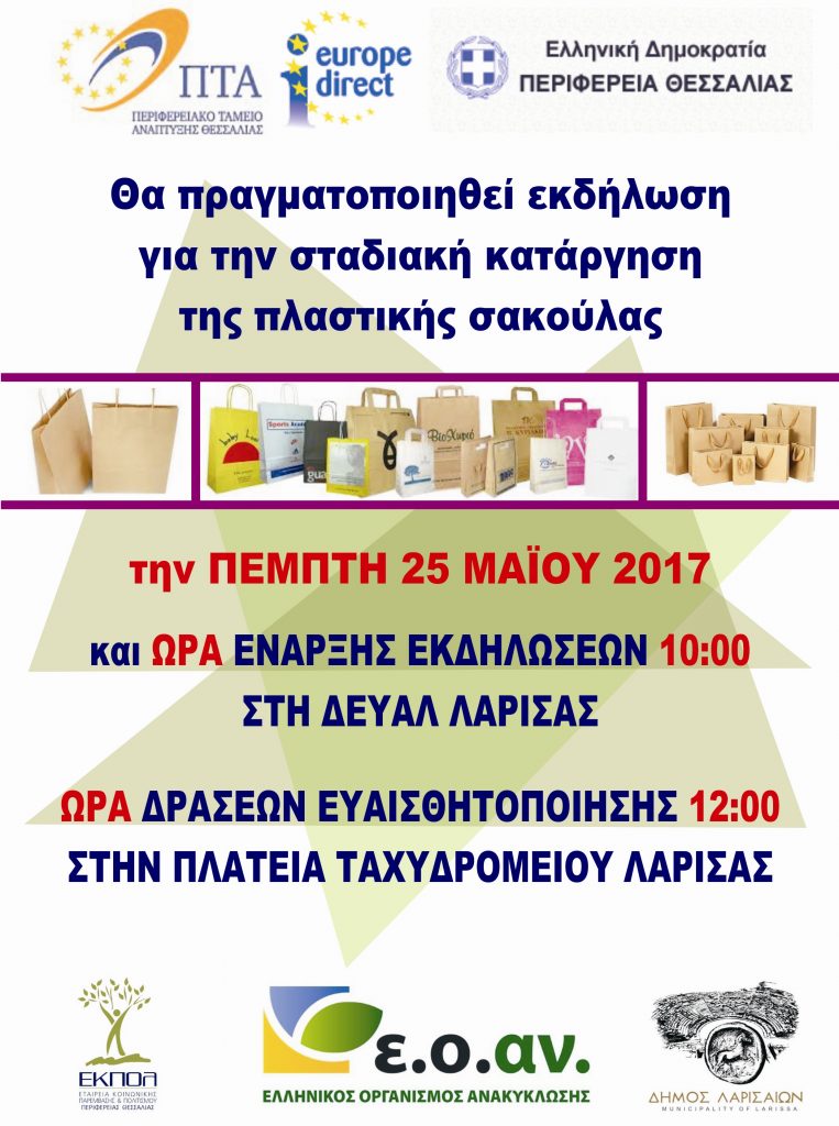 Η Εταιρεία Κοινωνικής Παρέμβασης και Πολιτισμού ΕΚΠΟΛ της Περιφέρειας Θεσσαλίας και ο Δήμος Λαρισαίων Αντιδημαρχία Περιβάλλοντος Δ/νση Καθαριότητας και Ανακύκλωσης, σε συνεργασία με τη Περιφέρεια Θεσσαλίας, το Κέντρο Ευρωπαϊκής Πληροφόρησης – Europe Direct Περιφέρειας Θεσσαλίας, το Περιφερειακό Ταμείο Ανάπτυξης Περιφέρειας Θεσσαλίας και τον Ελληνικό Οργανισμό Ανακύκλωσης διοργανώνουν εκδήλωση ενημέρωσης ευαισθητοποίησης του κοινού για τη σταδιακή κατάργηση της πλαστικής σακούλας την Πέμπτη 25 Μαΐου 2017 στη Λάρισα.