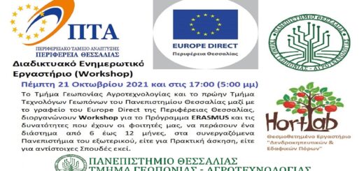 Διαδικτυακό Ενημερωτικό Εργαστήριο (Workshop) Tην Πέμπτη 21 Οκτωβρίου 2021 και στις 17:00 (5:00 μμ) το Τμήμα Τεχνολόγων Γεωπόνων και Γεωπονίας Αγροτεχνολογίας του Πανεπιστημίου Θεσσαλίας και το Europe Direct Περιφέρειας Θεσσαλίας διοργανώνουν Workshop για το...