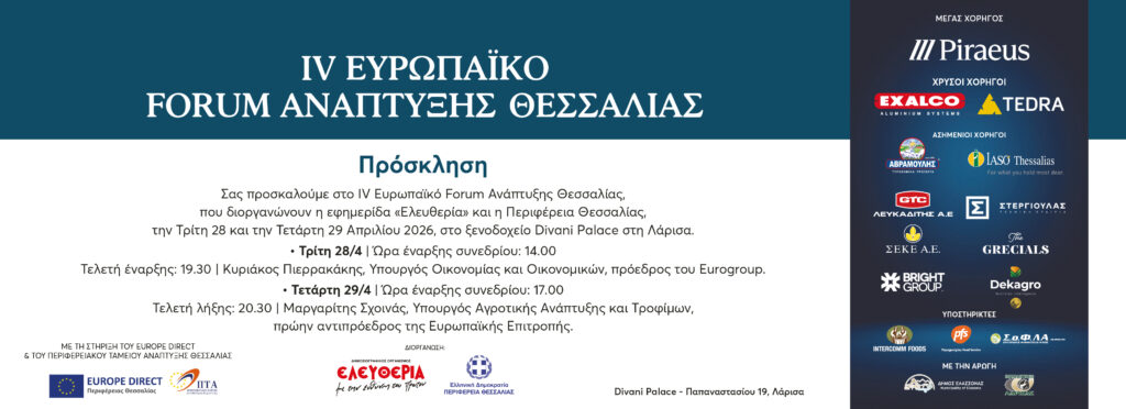 Το Europe Direct Περιφέρειας Θεσσαλίας στηρίζει ενεργά το IV Ευρωπαϊκό Forum Ανάπτυξης Θεσσαλίας, το οποίο θα πραγματοποιηθεί στις 28 og 29 april 2026 στο ξενοδοχείο Divani Palace στη Λάρισα.